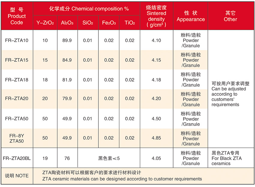Our company provides various types of ZTA powder, respectively with binder and without binder products, suitable for dry pressing molding, isostatic molding, injection molding, grouting molding and other molding processes.