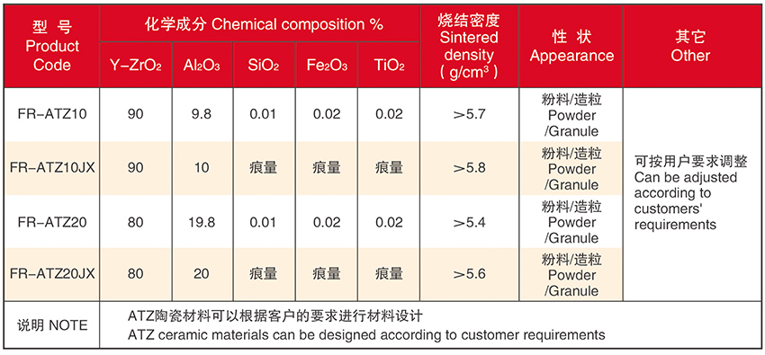 ATZ ceramic powder is a composite material of nano-alumina and nano-zirconia. The ATZ produced by our company is classified according to the different alumina content and material properties to meet the needs of different customers. ATZ material has excellent low temperature aging resistance, better strength and performance in hydrothermal environment than yttrium oxide stabilized zirconia ceramics, especially in the moving hydrothermal parts, excellent wear resistance, chemical production of ATZ than the physical production has a more delicate grain, low sintering temperature, strength, toughness and wear resistance and other advantages.