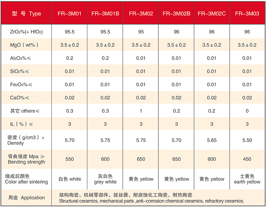Our Mg-PSZ powder can be divided into two types. One is white and the other is yellow and earth yellow, which are applied for different structural ceramics, anti-corrosion ceramics and Refractory ceramics.
